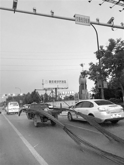 近日,记者在市中区振兴南路的经济开发区看到一辆三轮车拖着约8米长的钢筋危险的行驶,由于钢筋拖地一路摩擦出火星,看上去十分危险,周边一同行驶的车辆无不避之。 (记者 王萍 摄)