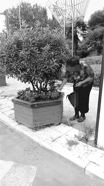 7月30日,市中区建设路与文化路交叉口的一侧一个花坛旁,一位四五十岁左右的女士正在一朵一朵地采摘花坛里的小黄花,有的甚至连根拔起,丝毫不顾及周围人的眼光。 (记者 张琛 摄)
