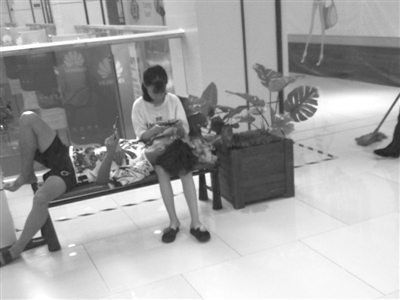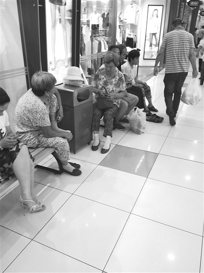 紧接着,记者来到了中央广场,在中央广场的二楼中间有一排长条的休息座椅,两位大妈正头对头地躺着聊天,原本可以供多人休息的座椅,被两人霸占。此外,记者在三楼的休息座椅上也看到正在睡觉的一位大爷。几名路过想要歇歇脚的顾客,见此情景只能无奈离开。