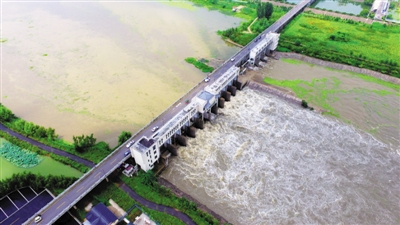 2日,京杭运河台儿庄节制闸提闸泄洪。受台风“海棠”影响,我市迎来强降雨,台儿庄节制闸3日晨提闸8孔泄洪,京杭运河台儿庄段流量达每秒800立方米。市海事部门、台儿庄区公安分局运河水上派出所联合巡查,并组织警员来到辖区码头,帮助船民做好各类船舶加固防护。 (特约记者 高启民 摄)