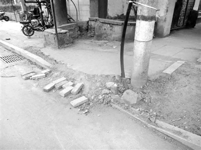 另外家属院门前通往胜利路的连接处,虽然在修路时,工人将路沿石刻意放低,留有一个坡面,以供车辆行驶时方便,但该坡面却没有用水泥硬化,依然是破损严重,影响人车通行。无奈之下,有居民找来几块板砖,垫在破损处,以凑合着方便过车。但没几天,这些板砖竟然被修路的工人全部收走。