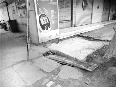 小刘说,近一年来市中区胜利西路修路,他们家所在的九中家属院就在这条路上。目前家属院门前商铺门口的地面早已完成竣工,但不知为何,家属院大门一侧有一段路面却没有抹上水泥填平,留有一个大坑。居民进出小区时,都会靠一边走,唯恐掉进了坑里。而车辆进出时更是深受影响,特别是在晚上,更是不方便,车轮一旦陷进了坑内肯定上不来。有热心居民看到这个坑存在安全隐患,便找来了木板放在上面充当盖板,以免有行人不小心掉了下去。但这终归不是长法,最好的办法还是将坑填平或者加个水泥盖板。