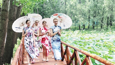 红荷含笑迎嘉宾,湿地有情留贵客,一群俄罗斯美女身着五颜六色的中国传统旗袍正在观看荷花。8月5日,第十四届中国(滕州)微山湖湿地红荷节开幕式暨2017山东省“送智下乡”旅游扶贫公益行活动在滕州微山湖湿地红荷风景区隆重举行。此次红荷节在承袭历届主旨、文化精髓的同时,增添了更为独特的红荷元素及更加有趣的体验活动,其中万人旗袍观荷邀请到了俄罗斯美女助阵,当异国情调与中国传统相遇,游客们的目光瞬间就被凝固了。(特约记者 侯志龙 金亮 实习生 郝存颖 摄)