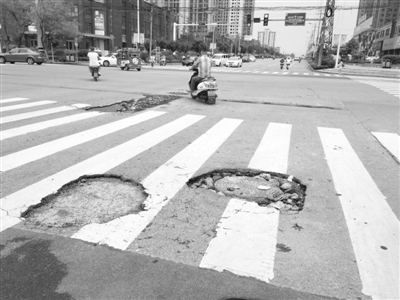 随后,记者赶到李女士所说的位置。据记者现场观察,李女士所说的损坏路面,均位于文化路和华山路十字路口北侧人行通道附近。记者看到这些坑洼的地方总共有四处,面积均较大。有两处坑洼地中还有铸铁井盖,其中位于道路东侧非机动车道与机动车道上的那个井盖倾斜在路面上,它的周边还有五六公分的坑洼,坑洼中有很多碎石,每当有机动车驶过记者就会听到车轮碾轧井盖发出的“哐当哐当”刺耳的声音。