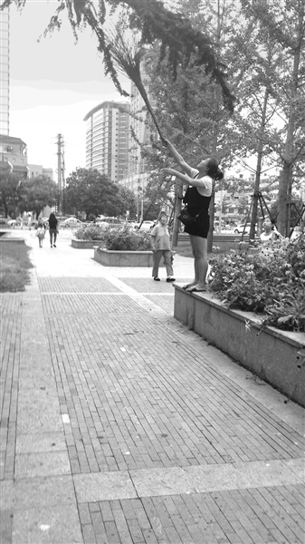 晚报讯 (记者 姚付林 摄影报道)近日,在滕州市杏坛广场一棵老树下,一名女子带着孩子采摘树上的果子,现场有路过的“好心”市民还给予了帮助。据介绍,由于树上长着看似干果的东西,形状大小如拳头般,该女士带着孩子经过树下,在孩子的央求下,母亲便拿来了旁边的一个大扫帚,站在花池的沿上,将树梢扒低一些,然后用手拽住树梢,随后进行“采摘”。过程中,女子的孩子就在她的旁边抬头观看。