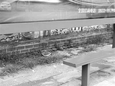 6日,市中区华山路某公交车站点,一候车的市民将吃剩下的西瓜皮随手一甩,扔到了候车站的展示灯箱后,而西瓜皮所扔的地方距离垃圾箱的位置只有三步远。 (记者 黄天鸽 摄)