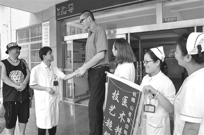晚报讯 (记者 孔浩 摄影报道)8月7日上午,一位身材高大的“巨人”,拿着一面内容为“医术精湛,技艺超群”的锦旗,走进了山亭骨伤医院,立马便吸引了众人的眼球。原来,这位“巨人”就是我市走出去的公益明星张欢,这次他是在经纪人王冬冰的陪同下,专程来到骨伤医院,向治好了他的腿伤的大夫表达感激之情的。