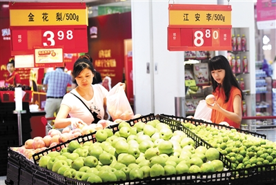 8月9日,市民在重庆市渝北区一家超市内选购水果。当日,国家统计局发布数据,7月份,全国居民消费价格指数(CPI)同比上涨1.4%,涨幅比上月回落0.1个百分点。统计显示,7月份,构成CPI的八大类商品和服务价格六升两降。其他七大类价格同比六升一降。其中,医疗保健价格上涨5.5%,居住、教育文化和娱乐价格均上涨2.5%,衣着、其他用品和服务、生活用品及服务价格分别上涨1.4%、1.3%和1.1%。 (新华社)