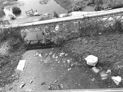 接到反映后,记者来到了薛城区泰山南路的一处小桥上,找到了马先生所说的这条小河,在小桥西面,记者看到了不少生活垃圾,水面上杂草丛生,到处漂浮着塑料袋和废弃纸箱子等生活垃圾,甚是脏乱。沿着小路来到河边,阵阵臭味扑鼻而来,河水也已变成暗黑色,污染非常严重。