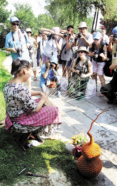 9时许,在古城西门,乾隆巡游开始了!气势磅礴的威风锣鼓,吸引摄影师们驻足观看,频按快门。接下来的运河大鼓、草编、柳琴戏等非物质文化遗产展示,也让大家啧啧称奇,相机快门声此起彼伏。在传统文化魔术表演时,有的摄影师都忘了手中的相机,纷纷要求魔术师慢一点,再慢一点。魔术表演完毕后,摄影师们仍沉醉其中迟迟不愿离开。