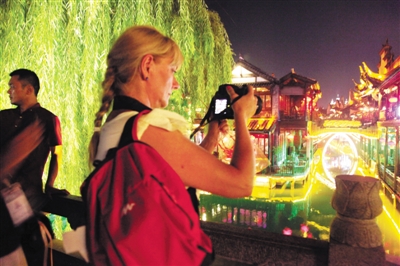 10日晚8时许,参加第五届世界摄影大会的国际摄影师们抵达台儿庄古城。夜幕下的古城,在灯与火的映照下,显得别有韵味。伴着《青花瓷》、《小城故事》、《映山红》等歌曲,渔家妹子在运河之上摇撸划桨,一时间,除了摄影师们不断的“amazing”、“beautiful”等赞叹外,就只有四面八方无间歇的快门声了。