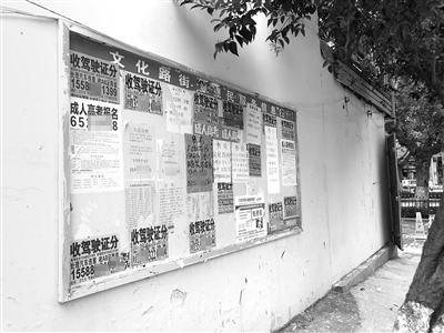 13日,记者来到秦女士所居住的小区内看到,设置在小区内的便民服务栏上,各种小广告随意张贴,其中以租房买卖的广告居多,其次是收驾驶证分数,对于广告的真实性无从考证。而且部分商家的大幅广告甚至将“便民服务栏”几个大字几乎全部覆盖,部分广告破损处也清晰可见。