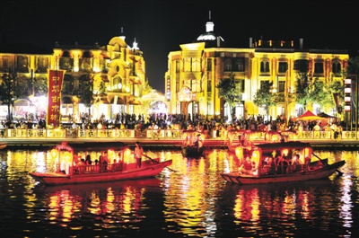 20日晚,台儿庄古城18个汪塘和30华里水街水巷灯火阑珊,游人泛舟摇曳,在古城运河河道里体验江北水乡的韵味,犹如“城在水中坐,人在画中游”。 (特约记者 高启民 摄)