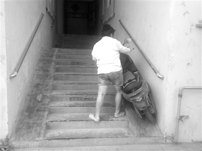周女士所住的一号楼楼道由于斜坡太陡,导致每次推电动车进出单元门时,十分吃力。