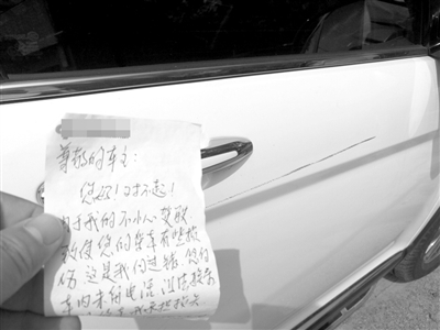 晚报讯 (记者 李帅 王伟 摄影报道)“我的爱车停在小区内被剐蹭,当时看到后气愤不已。可是围着爱车查看一圈后,在雨刮器上看到一张字条,顿时气消。”近日,家住市中区光明东路附近小区的居民李先生说。