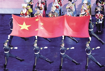 8月27日,旗手护送中华人民共和国国旗入场。当日,中华人民共和国第十三届运动会开幕式在天津举行。(新华社)