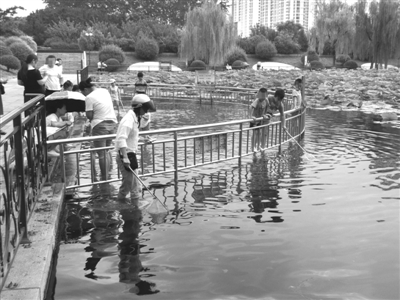 晚报讯 (记者 王晨曦 摄影报道)天气炎热,市民喜欢亲水纳凉,有花有水的地方成为市民的好去处。然而,池边捞鱼、下水摸鱼,或者直接用饮料瓶布下“迷魂阵”捕捉水池中的游鱼,俨然成为常见的现象,公共场所的水池和游鱼不幸成了牺牲品。