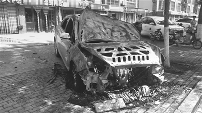 晚报讯 (记者 姚付林 摄影报道)近日,滕州华腾小区南的通盛路路北,一辆轿车停在路沿石上面被烧得面目全非,车头部分已经烧成了废铁,发动机裸露,车里面也被火吞噬烧焦,走近还能闻到刺鼻的味道。