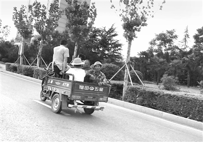 近日,记者途经光明路看到,一辆电动三轮车载着满满的一车务工人员摇晃行驶,小小的车内足足坐了5人,其中一人坐在了三轮车的边上,开车司机无不躲之。 (记者 王萍 摄)