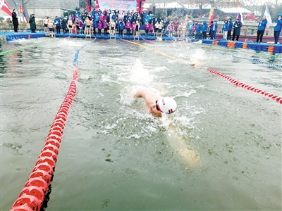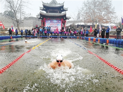 晚报讯 (记者 苏羽 摄影报道)1月7日,冬泳爱好者在京杭大运河山东台儿庄古运河的河道中畅游。当日正值数九寒天,第四届中国台儿庄古城国际冬泳节在台儿庄古运河举行,来自俄罗斯、爱沙尼亚、奥地利、拉脱维亚、蒙古等国的国际冬泳组织代表队及国内15个省市、山东省17个地市300余名选手参加,冬泳选手们不畏严寒,在冰水中尽情感受冬日运河的魅力。