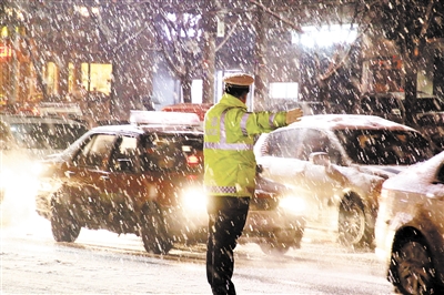 1月4日晚,滕州市大雪纷飞,滕州市交警冒着大雪在塔寺街中路指挥交通,确保车辆和行人安全。 (特约记者 侯志龙 摄)
