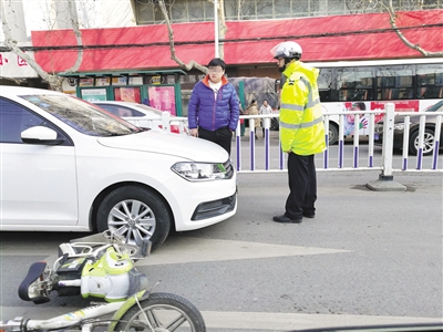 近日,在市中区解放路大观园文化市场东门附近,一辆电动自行车与一辆轿车发生剐蹭,电动车倒地,幸未发生大的事故。交警提醒市民,年关将近,路上车多人多,出行时一定要注意交通安全。 (记者 孔浩 摄)