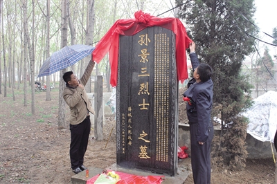 近日,孙景三烈士纪念碑在薛城区周营镇揭碑。孙景三1938年加入抗日队伍,在曹家埠、西杨庄、周营等对日战斗中英勇作战,为创建运北根据地做出突出贡献。1945年在石门村执行任务时,为掩护9名战士安全撤退,在大火中壮烈牺牲,时年31岁。 (记者 苏羽 摄)
