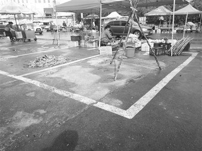 “就是他们,天天在这里卖菜卖水果,把停车位附近围的严严实实的,我们怎么开车过去呀。”正在附近寻找停车位的私家车车主黄先生表示,每次来到这边办点事想要停车时,都感到十分郁闷,明明眼前有停车位,却因商贩阻路,不能把车停到停车位里。