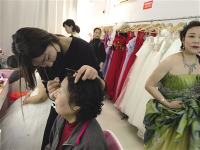 近日, 市中区解放路上一家婚纱摄影店推出了“重温昔日激情,定格风霜后的爱情,圆昨日未圆之梦”为老人免费拍婚纱照活动,每个老人不花钱就可以拍婚纱照。图为,化妆师在为老人化妆。 (记者 孙慧英 摄)