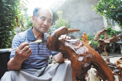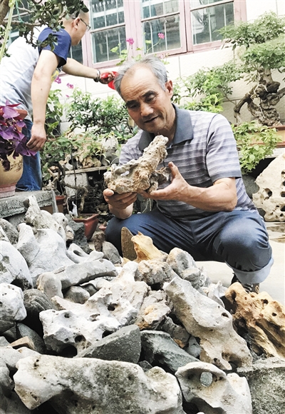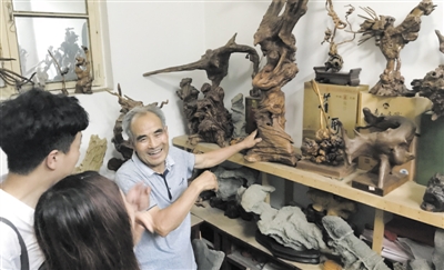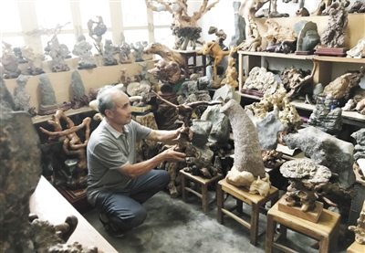寻找树根的同时,任振金不放过任何一块奇异有趣的石头。不管严寒酷暑,他卷着裤腿撸着袖子,扛着铁镐,脸被晒得黑黝黝的,每次扛回家的石头或树根,他都美滋滋的像得了奖赏一样快乐。17个年头过去了,任振金家的里里外外摆满了根雕和奇石作品,其中《中华魂》《擎天》等9件作品分别在省级花卉博览会获得金银铜奖。