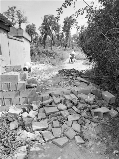 21日,记者来到了桃园小区5号楼,果然如居民所说,这里有条通向广场的小路,堵在路上的墙已经被人给扒开了,大砖块有的破损扔在地上,有的不见了踪影。在墙的下面是人们用碎砖块垫起来的通道,通道垫的比较高,只能容许底盘高点的电动车和自行车通过。在记者观察的10分钟时间里,一共有3辆电动车,5位老人从此经过。