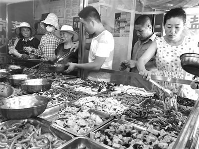 近日,在市中区幸福小区市场一家凉拌菜店铺前,围满了前来购买的市民,几十种凉拌菜任你选择。天气炎热,许多市民都习惯购买几份凉拌菜带回家,省时省力又美味。
