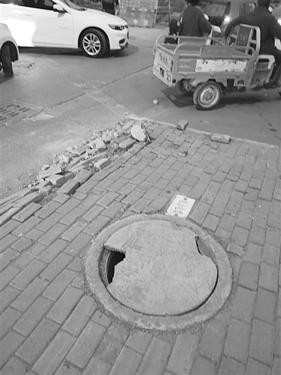 记着注意到,由于路面狭窄,路口处经常堵车,很多行人在经过时,不得不躲避那个被轧坏的窨井盖子。“盖子上面露出了两个洞,足以陷进去人的一只脚,稍不注意,有可能会被这个窨井盖子‘咬’一下。”路过市民张先生说。