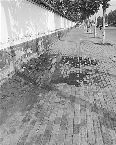 记者看到,在人行道西面的墙根下,有一个被人凿出来的洞,脏水从墙根下的洞中流出,人行道上已经被脏水霸占了很大一部分区域,行人经过时很不方便,而且这些脏水散发着难闻的气味。据介绍,此处人行道常年有脏水从墙内流出,有时候会将人行道“拦腰截断”,给附近居民带来很大的不便。