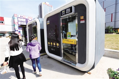10月25日,西安高新二路,两个共享健身房矗立路边,每个面积约4至5平方米。房内放置了一台跑步机,还配有电视、空调、空气净化器和WiFi,费用标准为0.2元/分钟。(新华社)