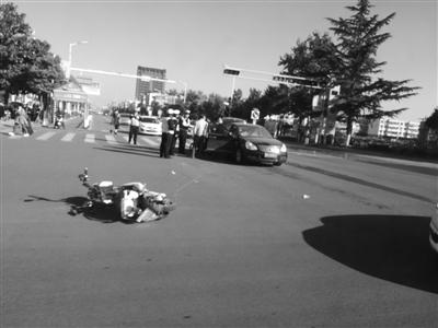 近日,在市中区青檀路与光明路交会路口处,一辆小轿车将一辆电动自行车撞倒,引路人围观。 (记者 孔浩 摄)