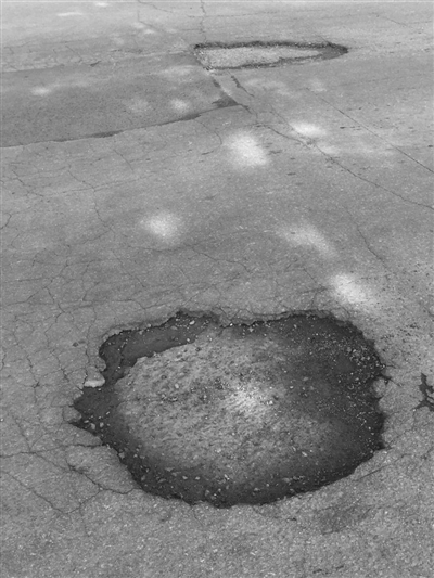 记者看到,不少行人被迫走在路中央,还要时不时地躲着这些“连环坑”。趁着路过车辆较少时,记者仔细看了看这几个“连环坑”。一个大坑长约60厘米,宽约50厘米,深约5厘米。另一个坑,在此坑约2米外的西南位置,长约30厘米,宽约25厘米,深约3厘米。看来“连环坑”并未修补过,与5月份的时候记者看到的一样。