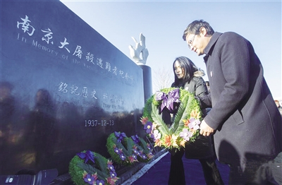 12月9日,在加拿大安大略省里士满希尔市,加拿大联邦国会华裔议员关慧贞(左)和谭耕在“南京大屠杀遇难者纪念碑”前敬献花圈。加拿大华侨华人9日在安大略省里士满希尔市举行“南京大屠杀遇难者纪念碑”落成揭幕仪式,加拿大国会议员代表,加拿大联邦政府、安大略省和多伦多市代表,中国驻多伦多总领事及其他国家驻加使领馆官员、社团等各界代表共2000多人出席。