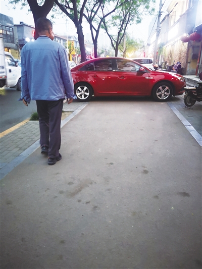 近日,滕州市塔寺路附近,一辆红色小轿车横着停在非机动车道上,来往行人不得不绕行。记者调查发现,有很多车辆停在非机动车道上,非机动车道彻底成了停车场。(记者 姚付林 摄)