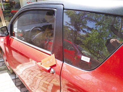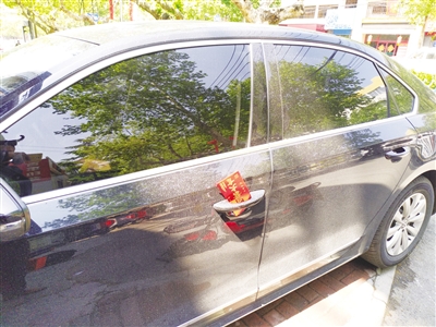 近日,记者在市中区文化中路附近,发现有多辆汽车门把手上夹着神秘的红包,有好奇的车主打开后发现,是某加油站的促销广告,车主纷纷表示这样的促销让人哭笑不得。 (记者 王正 摄)