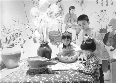 5月4日,滕州市两位母亲带孩子到山亭区冯卯镇李庄村的民俗大展厅,参观学习剪纸、编筐、插花等民间艺术,孩子们在这里学到了课堂上学不到的知识。 (记者 孙慧英 摄)