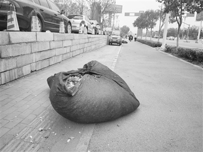 近日,新城祁连山路一绿化带旁,一个个黑色“包裹”被放置在路边。据了解,这些黑色袋子里装的是绿化带里的垃圾,将这垃圾打包,既方便运输,又能保证风不会把垃圾吹散。 (记者 刘一单 摄)