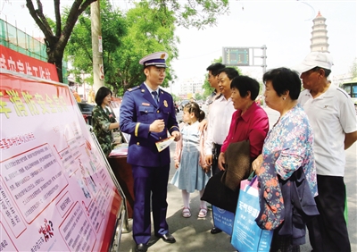 5月12日是全国“防灾减灾日”,滕州市组织公安局消防大队、红十字会、应急管理局、地震局等单位的工作人员及专家到龙泉广场等地设立宣传站,面向学生、社区居民、农村居民等不同人群,有针对性地开展消防、防震等减灾科普宣传,普及消防、防震减灾基本知识和防灾避灾、自救互救常识,增强群众自我保护和自救互救能力。 (特约记者 侯志龙 摄)