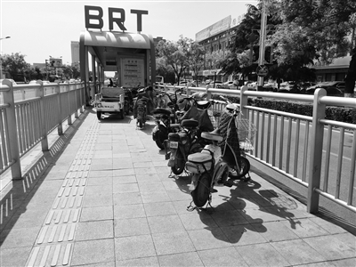 ▲近日,记者在市中区一BRT站台看到,站台通道内停放着多辆非机动车,几乎堵住了通道,进出的乘客需侧身通过。 (记者 李帅 摄)