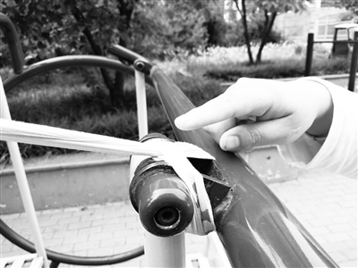 晚报讯 (记者 王龙飞 摄影报道)11日下午,市中区中安道南里小区2号楼前的一健身器材突然歪倒,业主李女士2岁女儿然然(化名)的脚被砸骨折,目前,李女士和物业双方还未就此事协商一致。