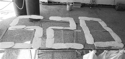 5月20日,市中区税郭镇小伙郝奥雷特意将自己做好的烧饼摆出一个520造型,以此来表达对远在东北女友的思念。 (记者 王正 摄)