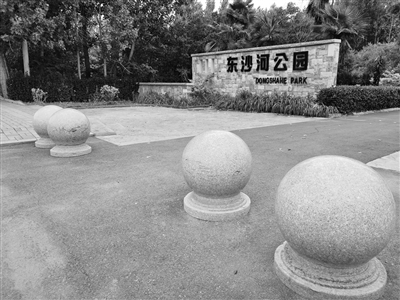 近日,记者在市中区东沙河公园入口处看到,隔离墩被挪开。“四个隔离墩形同虚设,各种车辆都能进入公园,很不安全。”市民张先生说。 (记者 李帅 摄)