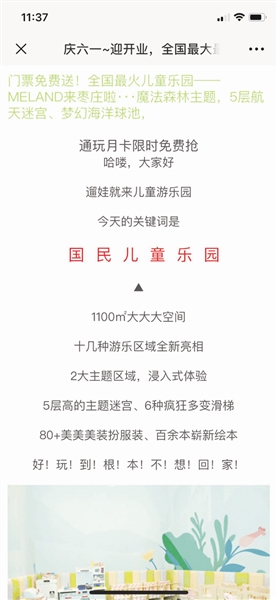 当日,记者根据范女士的提示,在朋友圈中找到了这篇文章的链接。点开链接,首先映入眼帘的就是“魔法森林”、“5层航天迷宫”、“梦幻海洋球池”“6种疯狂多变滑梯”“通远月卡限时免费抢”、“亲子月卡限量610张”等字眼,首页上还附带着各种各样美轮美奂的宣传图,十分吸引眼球。据记者了解,因为文章中还写着,转发该文章赠送610张亲子“月卡”,很多80、90后家长看到后纷纷转发,有些家长不仅自己转发还发动亲朋好友转发,希望自己能成为610名幸运者之一。