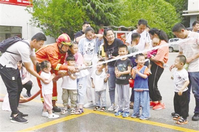 6月1日上午,滕州市消防大队组织20余个指战员家庭、40余名小朋友,共计80余人走进“红门”,大力开展“展示过硬形象、传承红门精神”亲子活动。 (记者 王龙飞 摄)