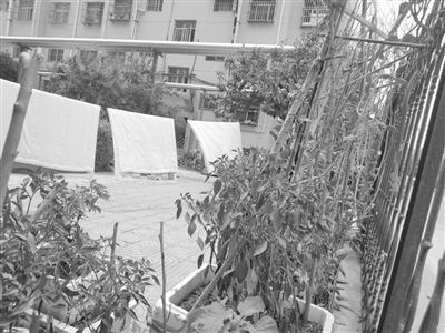 6月22日,记者见到了位于居民楼西侧的小菜园,小菜园由废弃的洗手盆、大花盆以及一个个泡沫箱组成,靠近小区西面的围墙。小辣椒、黄瓜、豆角等蔬菜硕果累累,为了便于让豆角“攀爬”,菜园主人支起了一根根小木棍,并把这些小木棍用尼龙绳绑到栅栏上。“尼龙绳五颜六色的,栅栏看起来乱糟糟的。”高女士说。